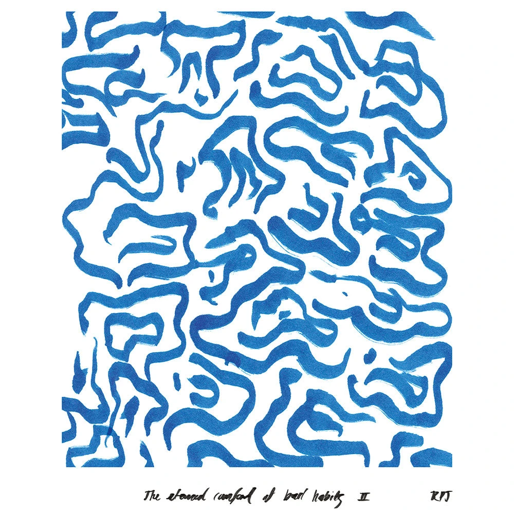 - Le motif montre une jungle confuse de lignes jaunes ou bleues.