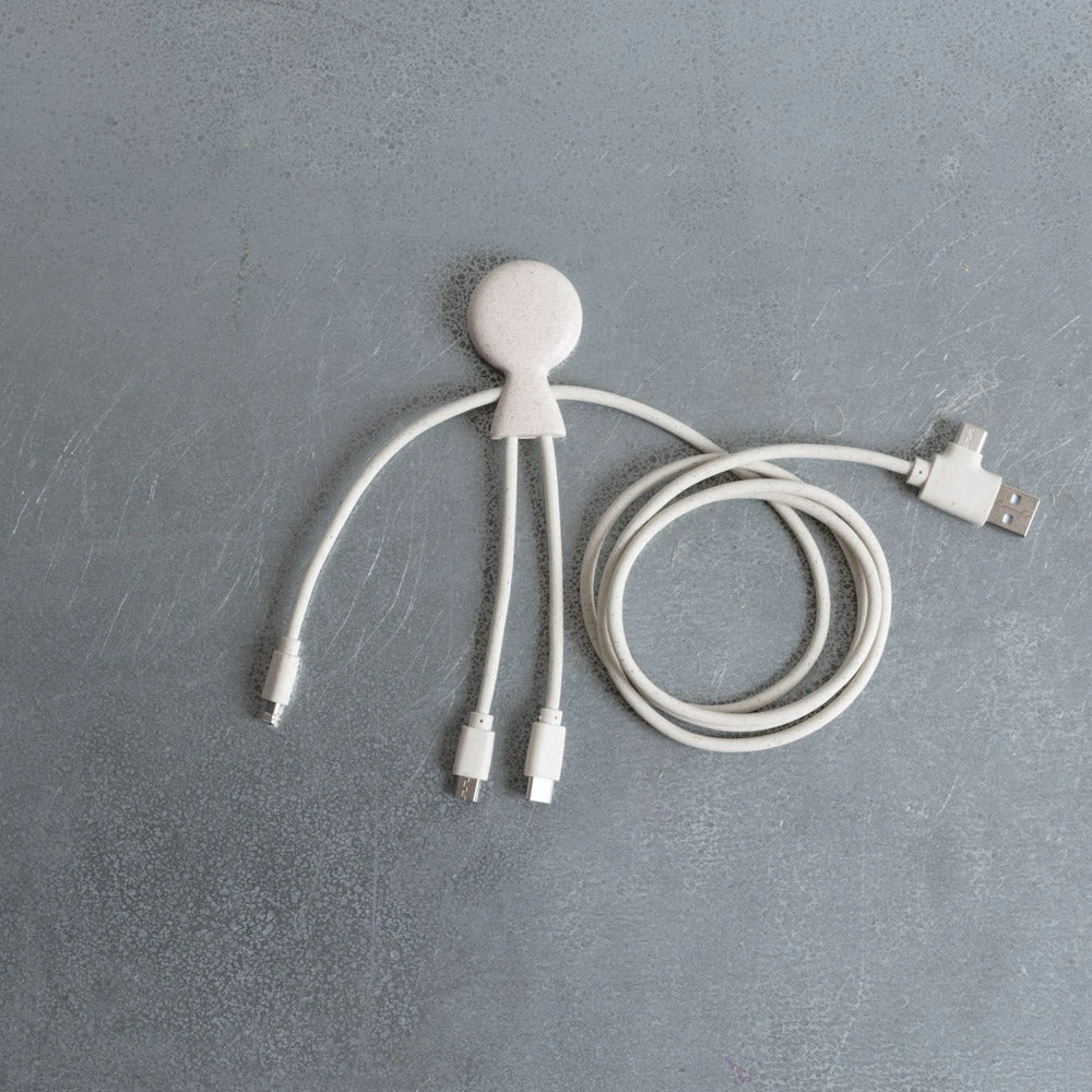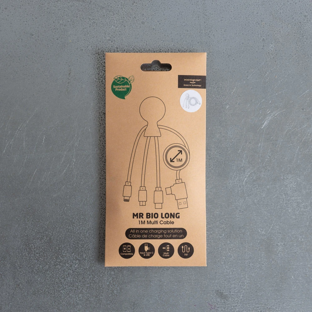 - Mr Bio est un câble de charge multi-connecteurs doté d’une connectique Type C In & Out, d’un câble Lightning, USB et Micro-USB. Grâce à lui, vous pouvez recharger n’importe quel téléphone portable et le reste de vos appareils. Très pratique, il s’intègre à votre trousseau de clés pour l’avoir toujours sous la main.
