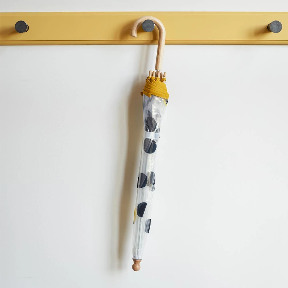 - Parapluie enfant transparent avec sa cloche imprimée avec un motif à pois irréguliers bleus marine et jaunes