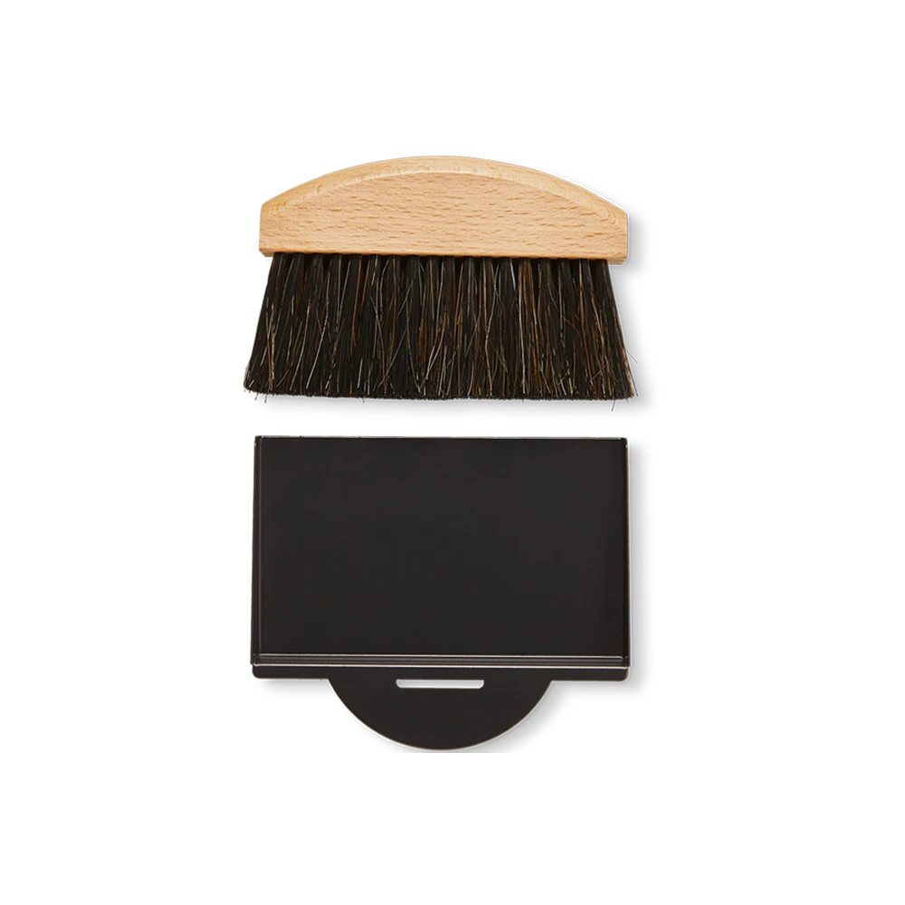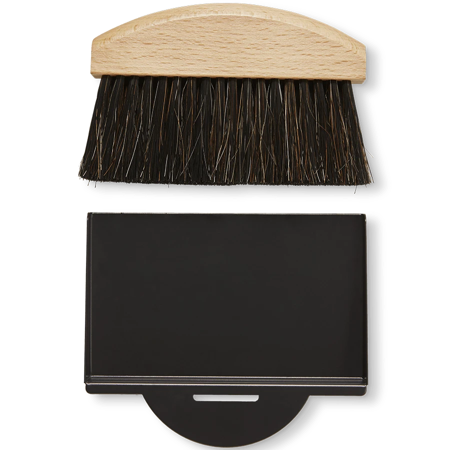 Ramasse-miettes noir comportant une pelle en tôle laquée et une balayette en crin et bois de hêtre laqué.