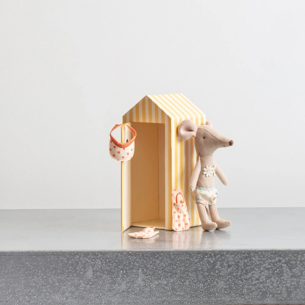 - Ha, les vacances. Cette souris est prête pour une journée à la plage, avec tous les accessoires nécessaires et une belle cabine de plage à rayures