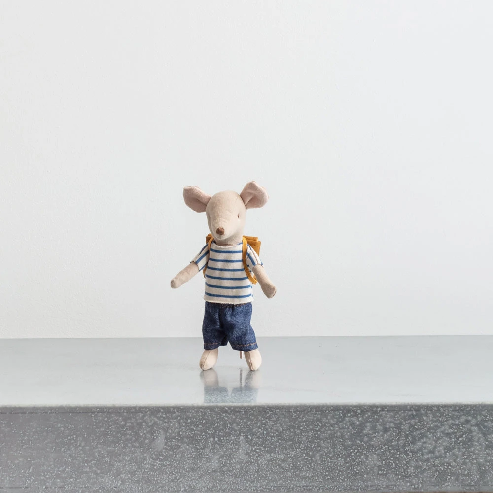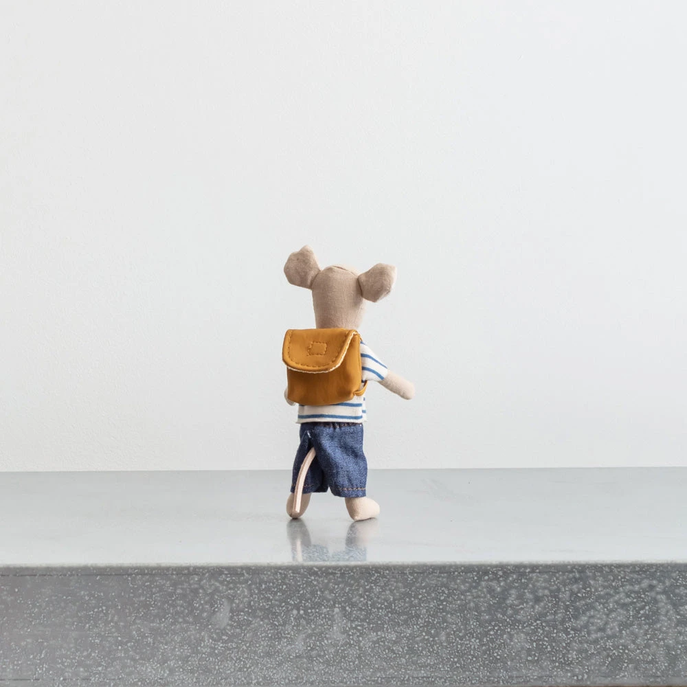 - Le grand frère souris est habillé pour une journée au jardin d’enfants ou à l’école, portant son sac à dos sur le dos