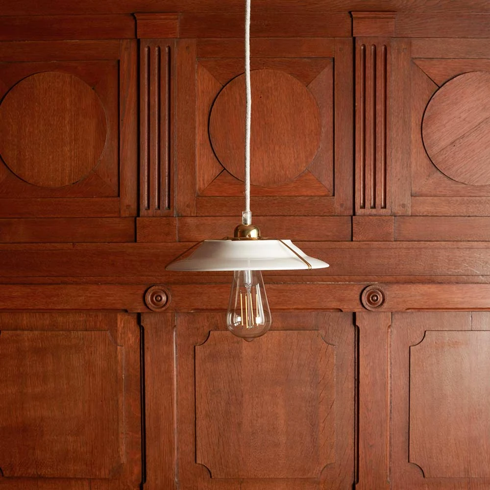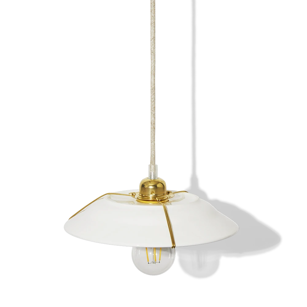 - Ce luminaire se caractérise par un design relativement simple mais parfaitement distingué. Sans détails superflus, il se compose d’une fine structure en laiton entourant une assiette en grès blanche qui fait office d’abat-jour.
