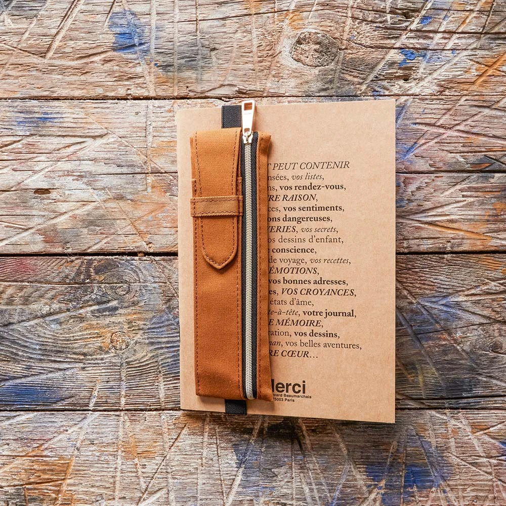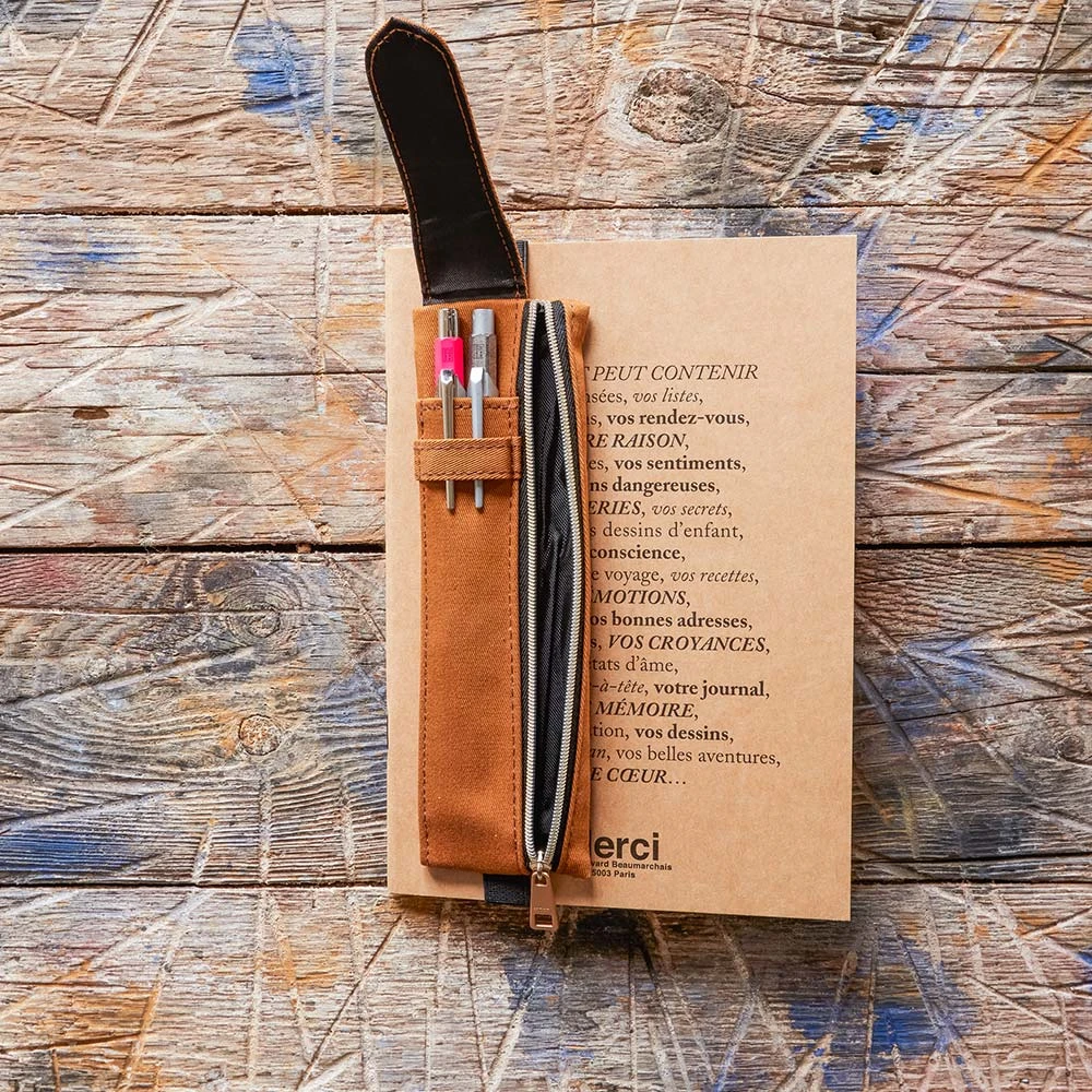 - Trousse avec bande élastique que vous pourrez ensuite attacher à votre cahier B6, A5, B5 ou même a votre tablette ou encore ordinateur portable