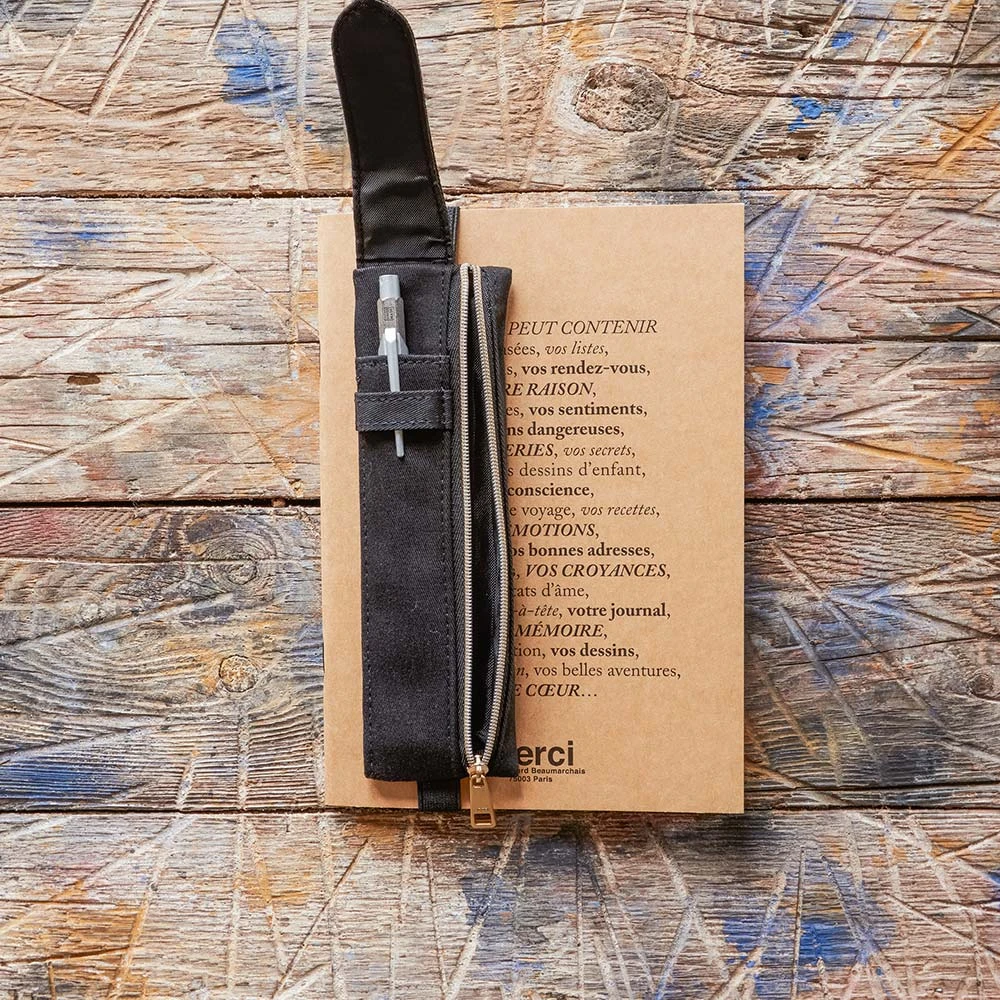 - Trousse avec bande élastique que vous pourrez ensuite attacher à votre cahier B6, A5, B5 ou même a votre tablette ou encore ordinateur portable